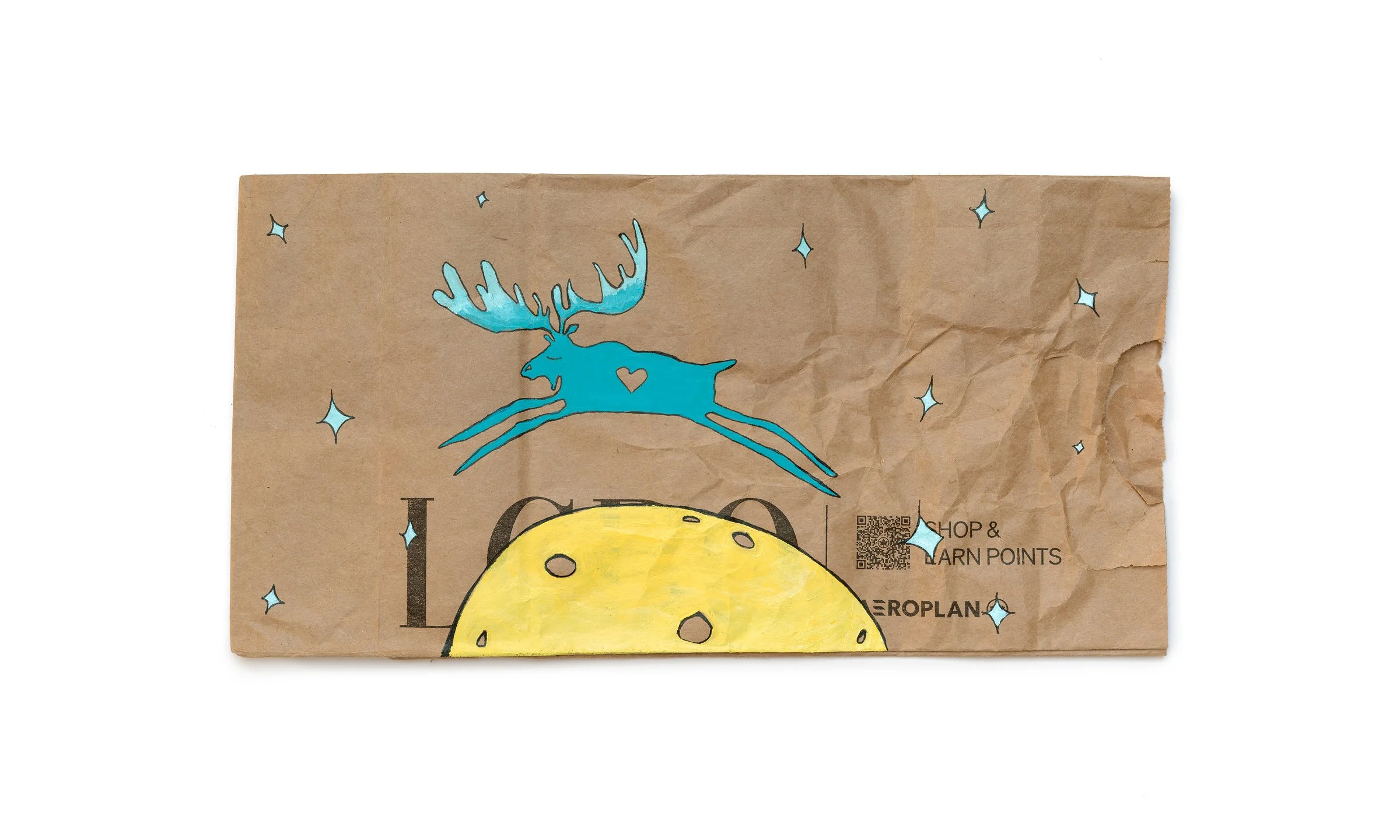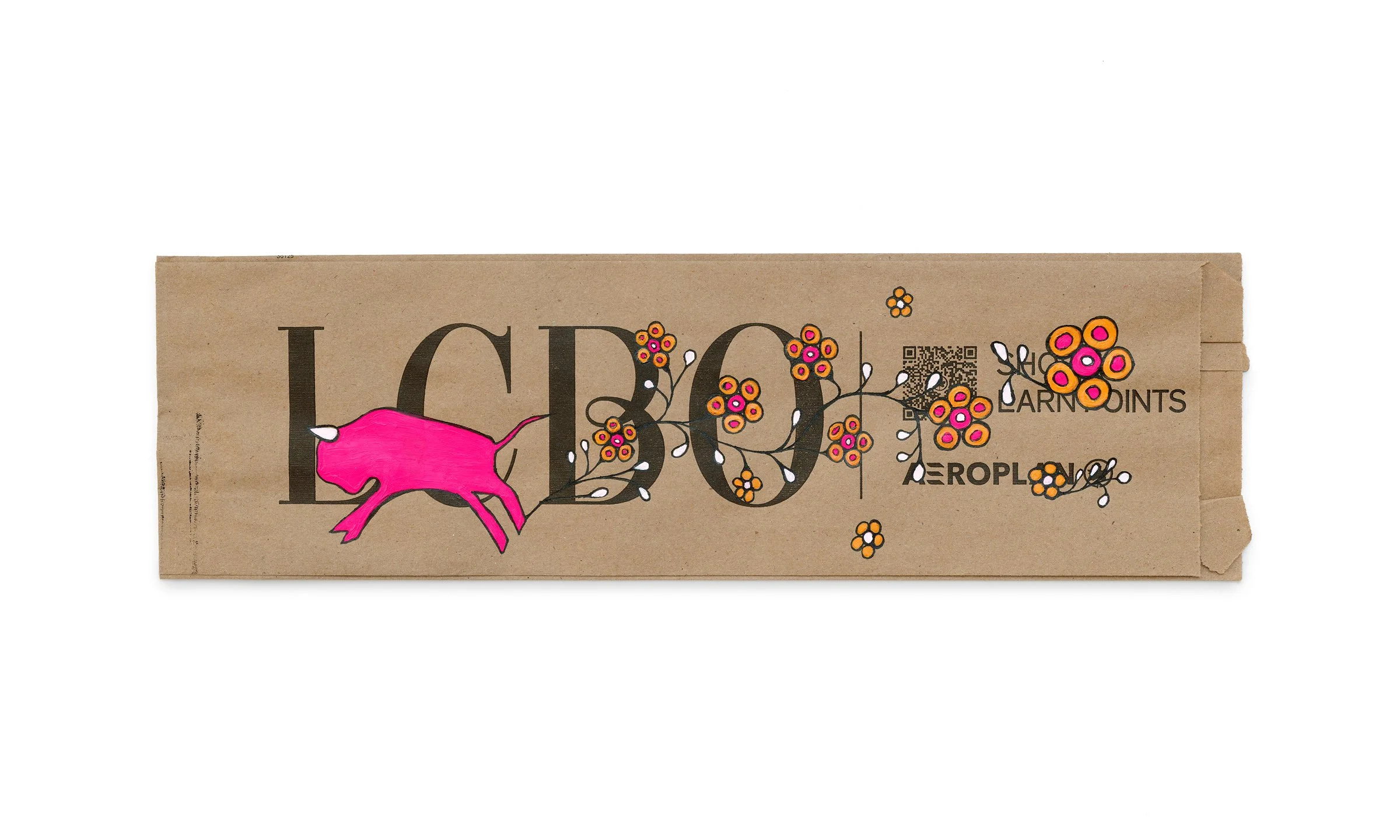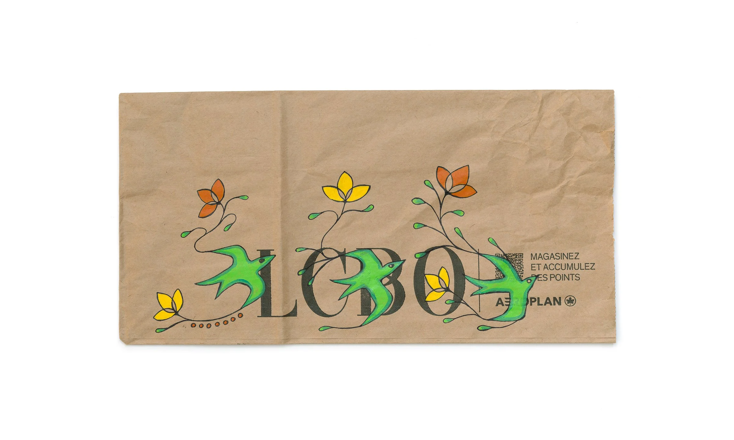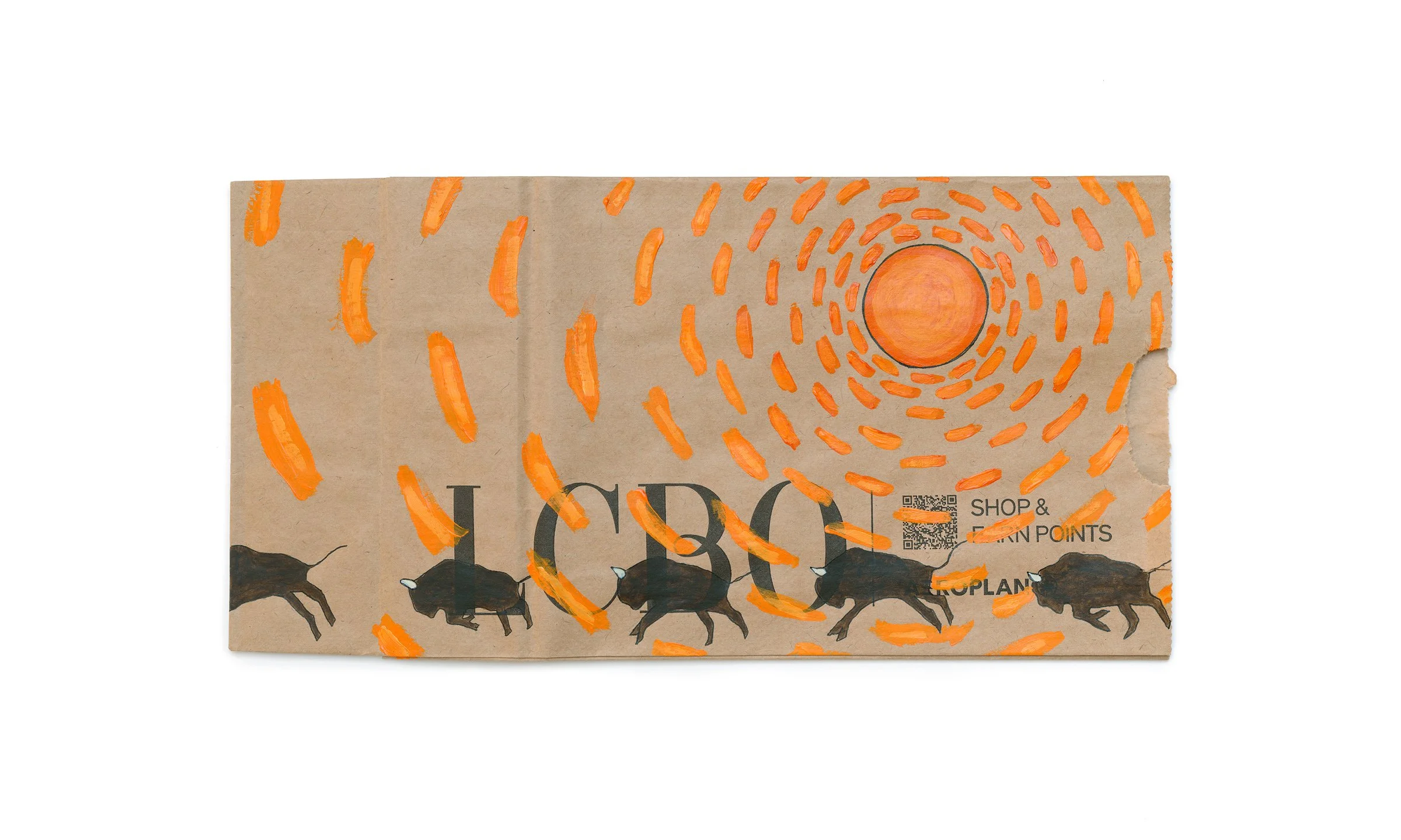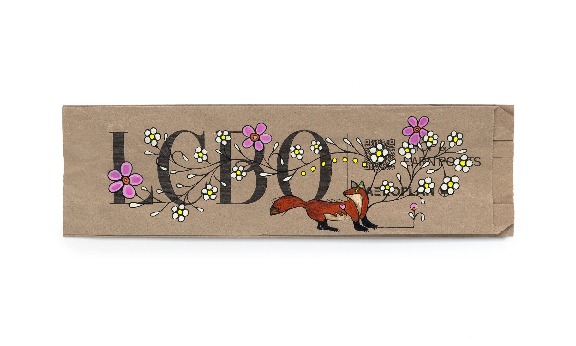 This series of work aims to disrupt the false and destructivenarrative of the “drunken Indian” through an exploration of visual brand recognition. The repurposing of a Liquor Control Board of Ontario (LCBO) bag as the canvas for traditional Woodland images symbolizes the erasure of harmful systemic stereotypes. The work is an invitation to engage in a more honest story that amplifies the resilience, brilliance and elegance of First Peoples, our cultures, traditions, and knowledge.